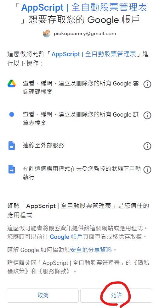 - 未經 Google 驗證[1] ➡ 點選 「進階」 ➡ 點選 「前往AppScript | 全自動股票管理表(不安全)」